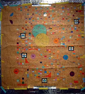 Theory 52, 2003, Stickers, color pencil, pen and ink, tape, butcher paper and tin foil on paper, 127 X 140 cm.