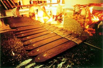 River of The King : Water Pollution Project One, 1993, Installation comprising zind boats,wood,rock,rope metal figure and candles