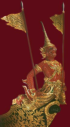 | The Sukreep Krong Muang Barge (No.10) The barge is adorned with the figure of the King of Ape, with red body, Sukreep , in Ramayana. It is gilded ceremonial barge, built in the First Reign of the Bangkok Period, measuring 27.45 metres in length, 1.95 metres in width, manned by 34 rowers. |
