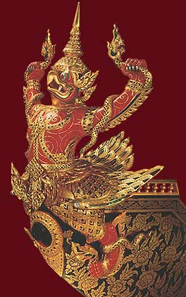 | The Krut Hern Het Barge (No.11) The barge has the garuda and naga at the bow, as ceremonial barge, painted, lacquered and gilded. It was built in the First Reign of the Bangkok Period. It measures about 27 metres in length, 1.90 metres in width, manned by 34 rowers. |