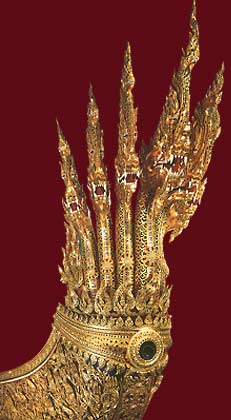 | The Anantanakharaj Royal Barge (No.4) The royal barge was built in the Fourth Reign, and remade in the reign of King Vajiravudh, Rama Vl, It is carved, gilded and decorated with mirror, patterned as a seven-headed serpent, surrounded by numerous small serpents. The hull is painted green on the outside and red on the inside. It measures 42.95 metres in length, 2.95 metres in width, 0.76 metres in depth, with a draft of 0.31 metres, and a 3.02 metres power, manned by 54 rowers and two steersmen, with two helmsmen, one flag-bearer, one signalman, and one boat-rowing song singer. |