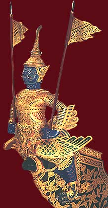 | The Asura Vayuphak Barge (No.5) The barge with the figurehead of the Demon King, is gilded ceremonial barge, built in the First Reign of the Bangkok Period. The Asura Vayuphak's face, hands and feet are indigo in colour, wearing purple. It measures about 30 metres in length, 2.00 metres in width, and manned by 40 rowers. |