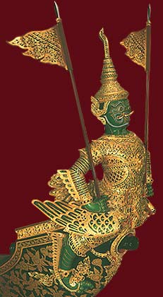 | The Asura Paksi Barge (No.6) The barge with the figurehead of the Demon King, is gilded ceremonial barge, built in the First Reign of the Bangkok Period. the Asura Paksi has green hands and feet, wearing green. It measures about 30 metres in length, 2.00 metres in width, and manned by 40 rowers. |