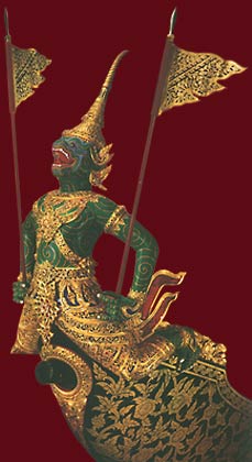 | The Pali Rang Thaweep Barge (No.9) The barge is adorned with the figure of the King of Ape, with green body , Pali , in Ramayana. It is gilded ceremonial barge, built in the First Reign of the Bangkok Period, measuring 27.45 metres in length, 1.95 metres in width, manned by 34 rowers. |