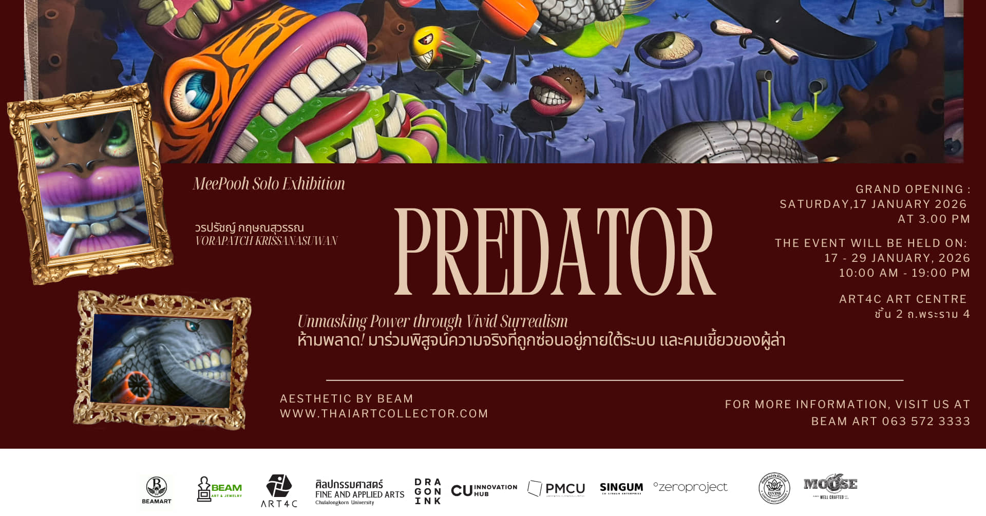 เชิญทุกท่านมาร่วม “ถอดรหัส” และ “กระชากหน้ากาก” ผ่านฝีแปรงแห่งจินตนาการใน “PREDATOR” นิทรรศการเดี่ยวครั้งแรกของปีที่ไม่ควรพลาด โดย วรปรัชญ์ กฤษณสุวรรณ (MEEPOOH)