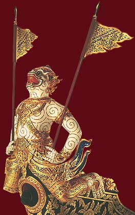 | The Krabi Prab Muang Man Barge (No.7) The barge is carved, gilded and decorated with mirror in the form of a Great Ape, the White Monkey. The exterior ot the hull is lacquered and gilded in stylized floral patterns. It was built in the First Reign of the Bangkok Period. It weighs 5.62 tonnes, measuring 28.80 metres in length, 2.10 metres in width, 0.56 metres in depth, manned by 36 rowers. |